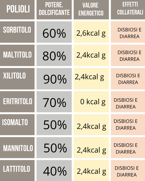 Riconoscerli è semplicissimo, poiché nella tabella nutrizionale viene riportata la voce “di cui polioli:”.
