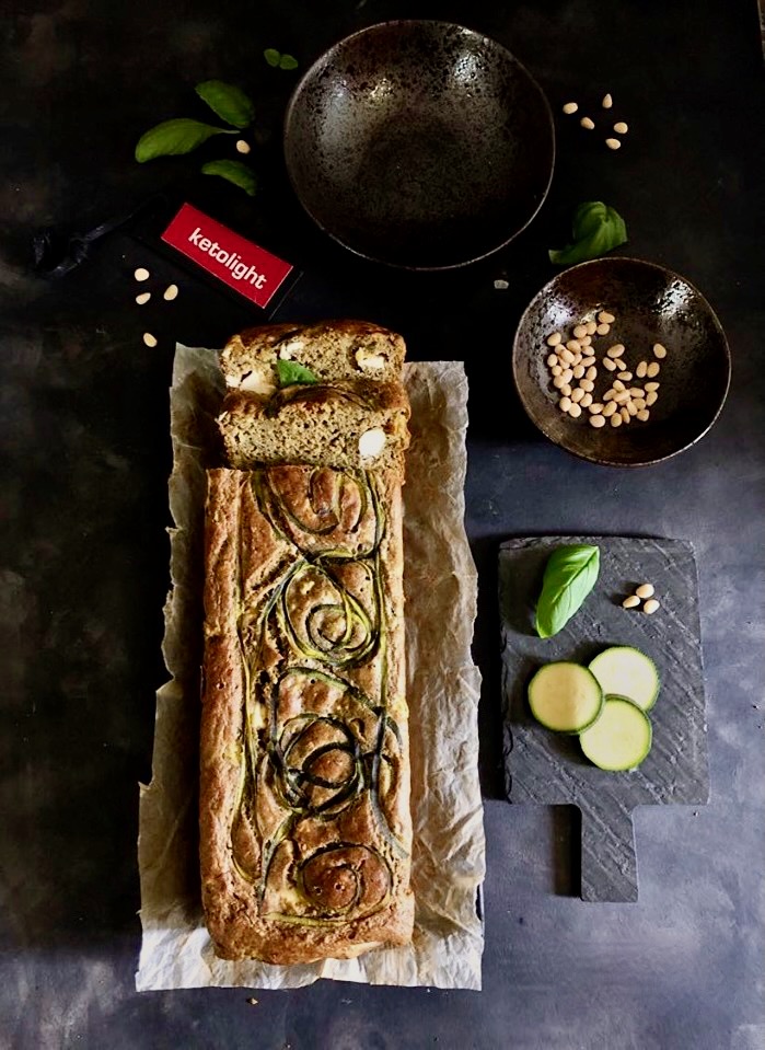 Per prima cosa tagliate le zucchine a spaghetti con l'apposito attrezzo e le mettete in uno scolapasta con un pizzico di sale per 5-10 minuti . In una terrina sbattete leggermente le uova con il latte, ed il pesto , aggiungete la KETOCOOKING FLOUR setacciata , il parmigiano grattugiato e mescolate con una frusta a mano infine, aggiungete il Cremortartaro e il Bicarbonato sciolti in poco latte. Strizzate bene le zucchine con le mani per eliminare l’acqua in eccesso e unitele all'impasto assieme alla feta greca tagliata a cubetti . Dopo aver rimescolato con una spatola, versate il tutto in uno stampo da plumcake da 28 cm rivestito con carta forno e fate cuocere in forno preriscaldato a 180 ° per 50 minuti circa Sfornate, fate raffreddare e gustate ……Squisito!!