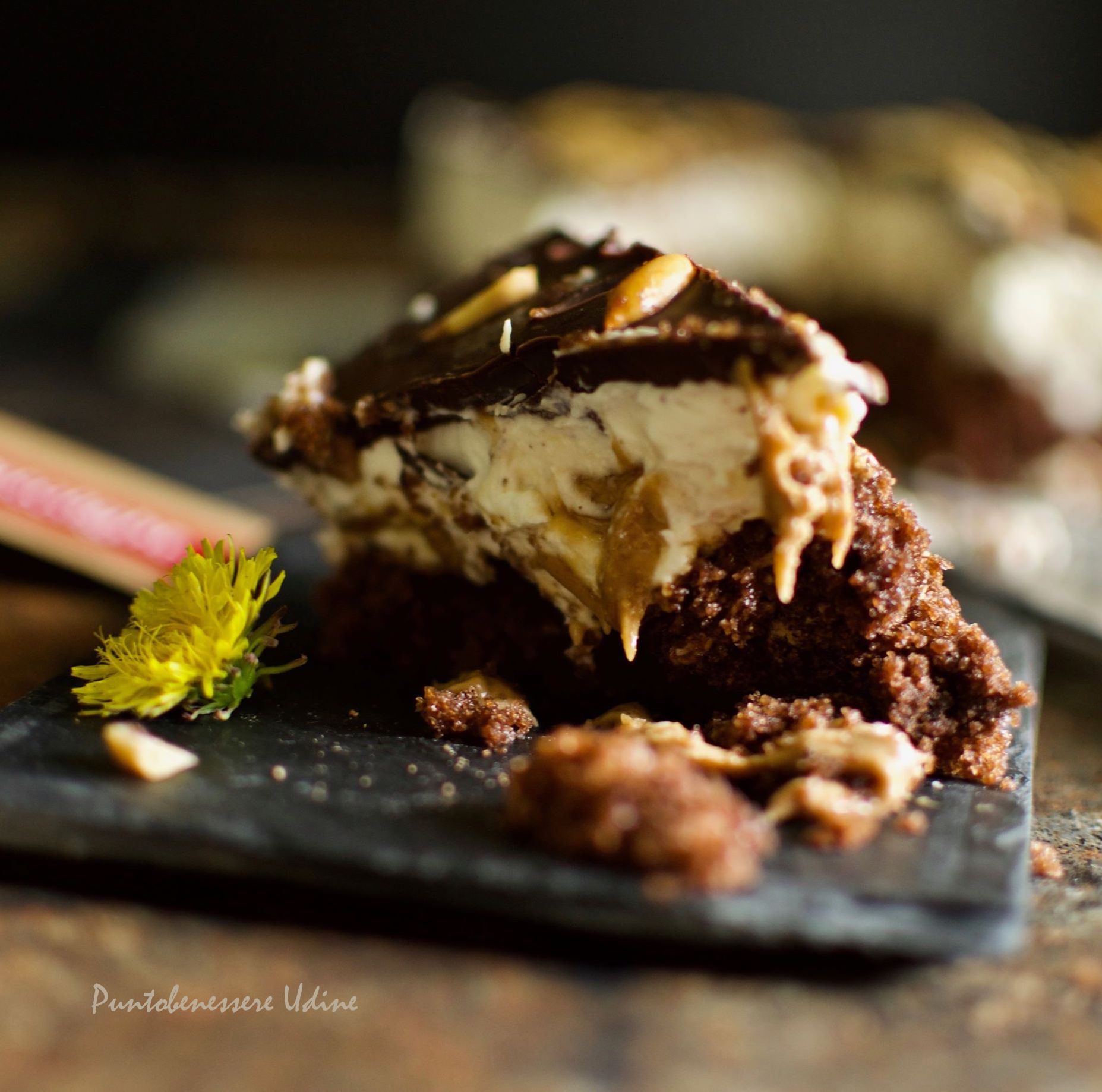 Sopra la base abbiamo versato la crema, livellato con una spatola e messo in frigo tutta la notte…il giorno seguente abbiamo sciolto a bagnomaria il KETOCACAO 100 con l'acqua e il KETOSUGAR VELO e versato la glassa ottenuta sulla crema e prima che si solidifichi abbiamo decorato con delle arachidi.