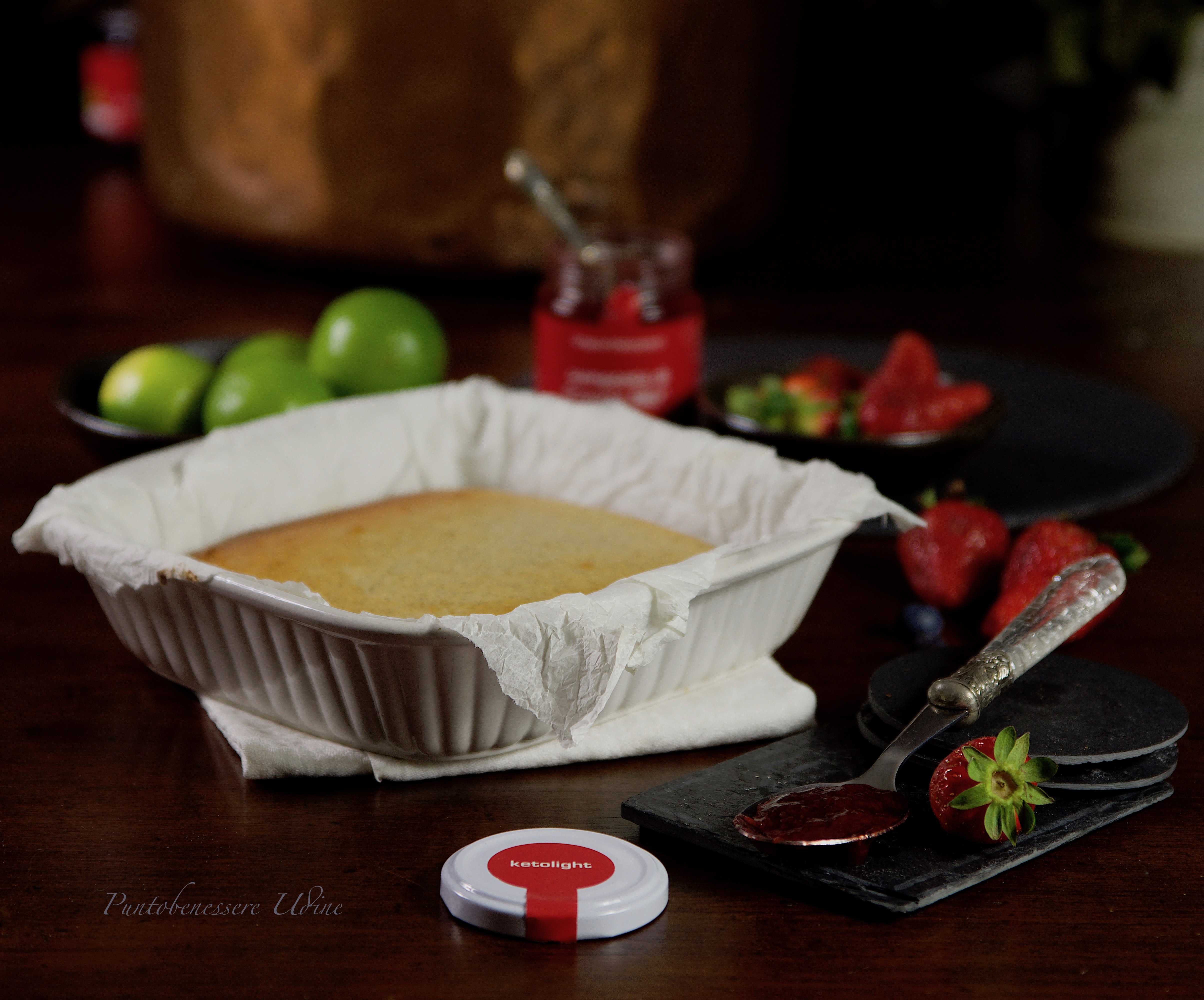Lasciate riposare la torta in frigorifero per 15 minuti quindi tagliate a quadrotti e decorate con la COMPOSTA DI FRAGOLE BIO con le fragole fresche, il lime, i mirtilli, e KETOSUGAR VELO KETOLIGHT .