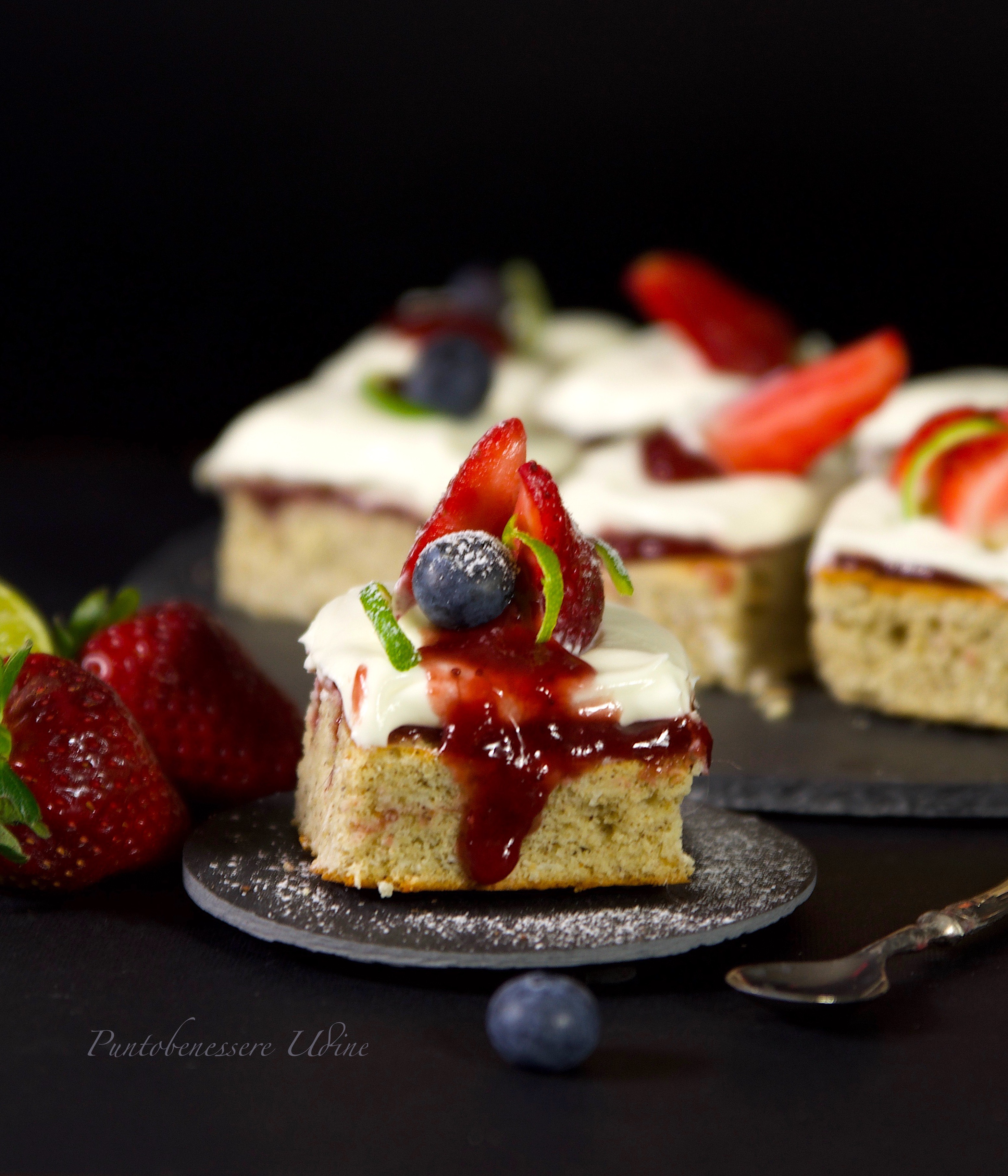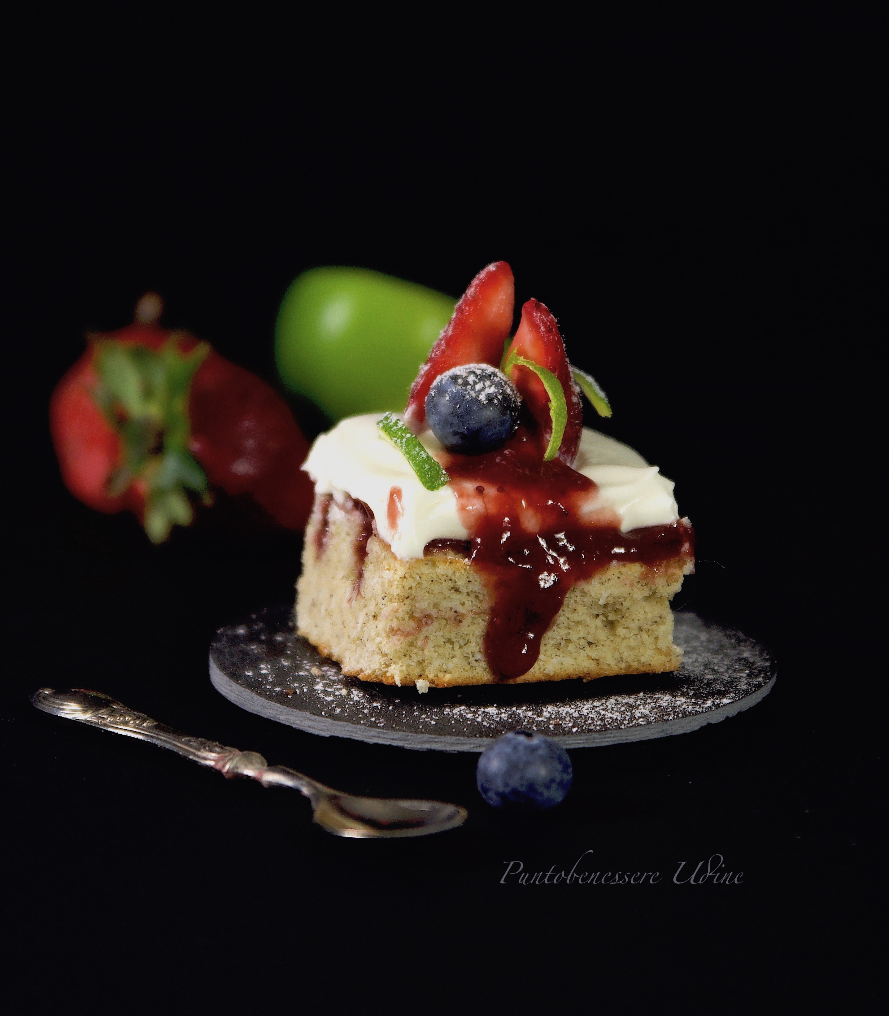 La base di questi quadrotti l’abbiamo preparata con dello yogurt grco montato con dell’ olio di cocco e del cocco rapé ,e dopo la cottura l’abbiamo arricchita con tanta confettura di fragole e un frosting di panna e mascarpone, profumato al lime. A chiudere questo viaggio di sapori dal trend primaverile , alcuni mirtilli freschi per dare quel tocco di colore e di acidità .