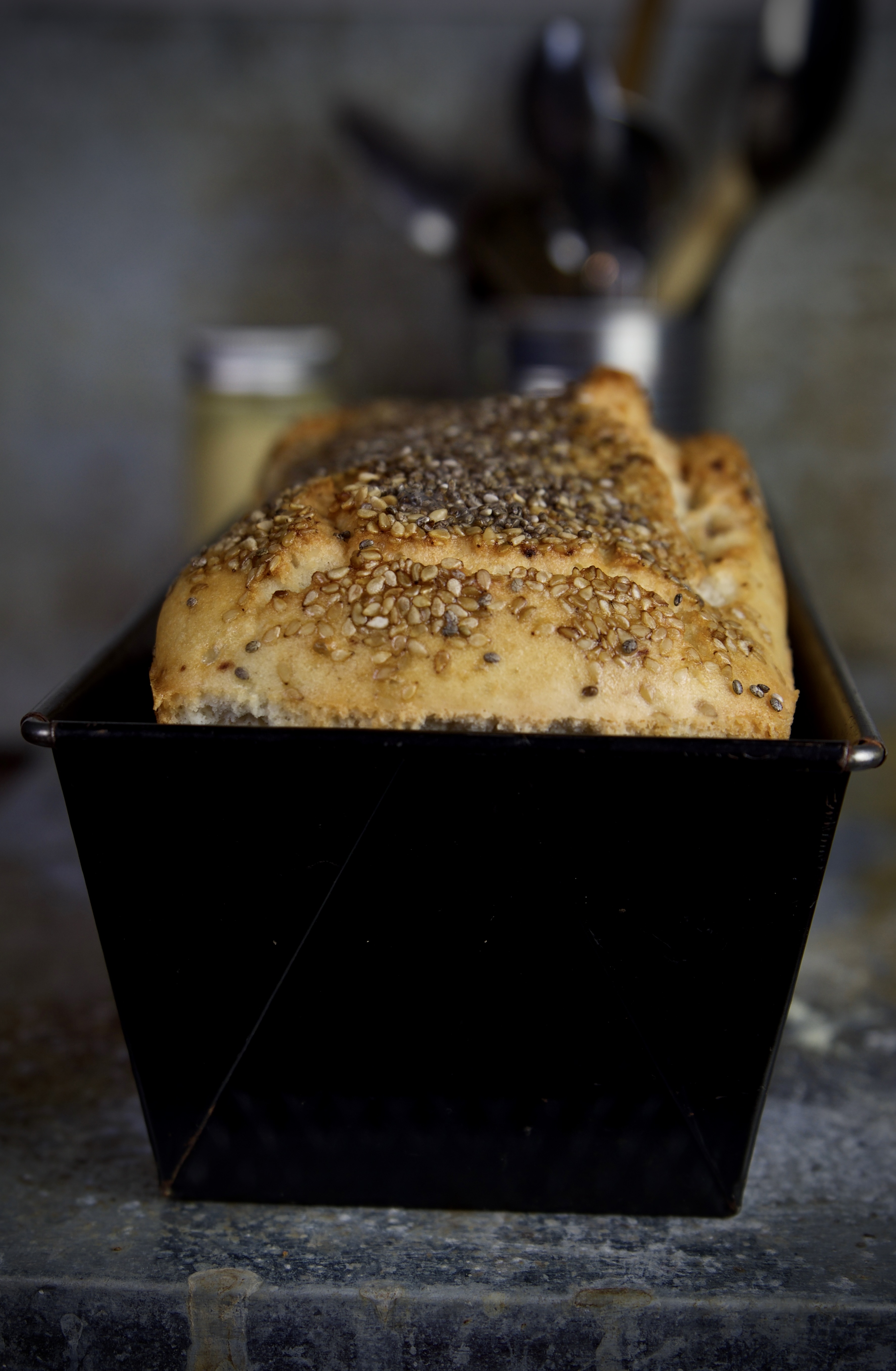 Mettete l'impasto in una teglia da plumcake , spolverizzate con i semi di sesamo e lasciare riposare in frigorifero per circa 30 minuti.