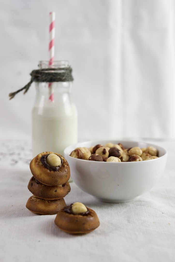 Preriscaldate il forno a 180º e ungete 12 pozzetti di una teglia per mini ciambelle e spolverizzate con della granella di nocciole.