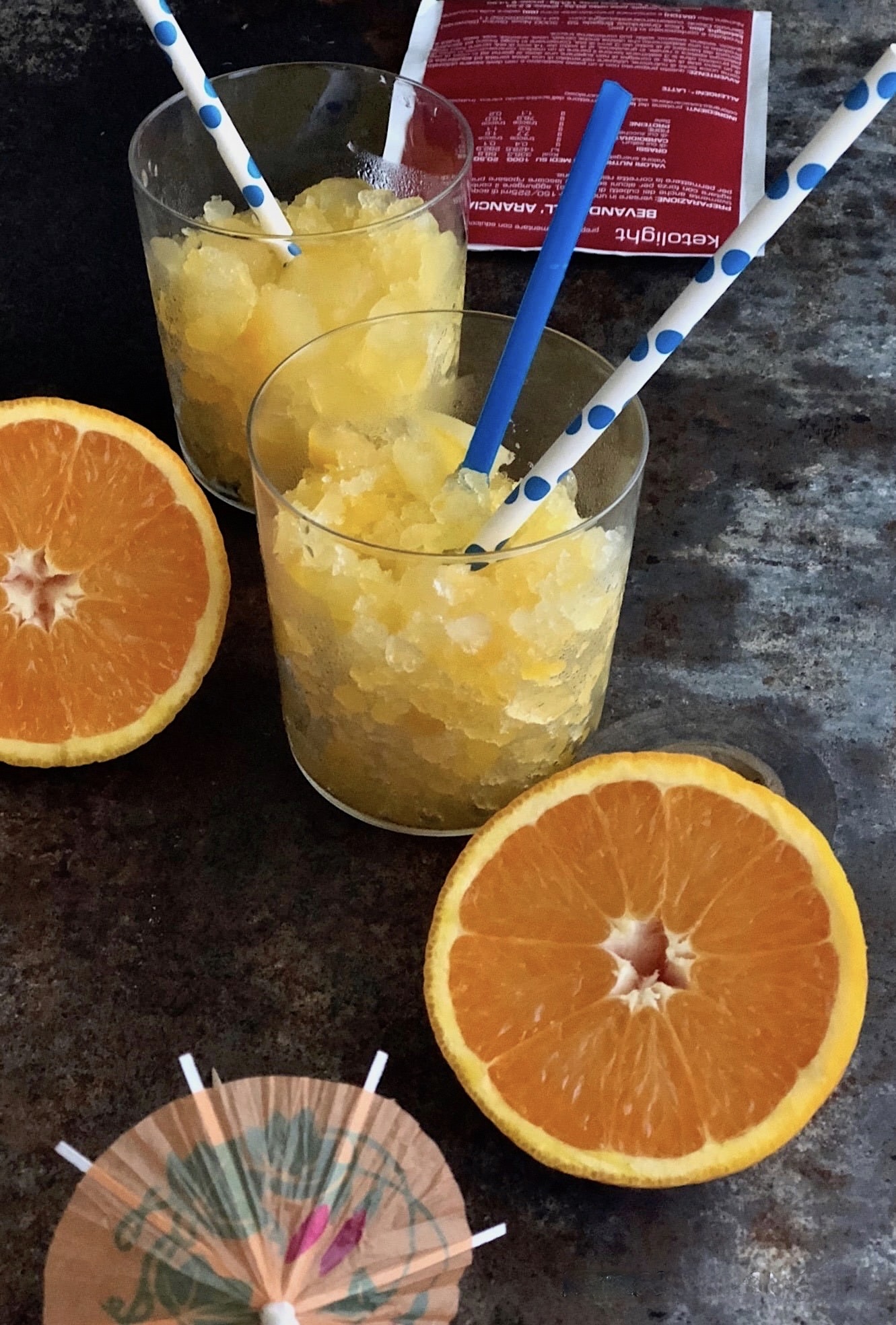 Con la KETOBEVANDA ALL' ARANCIA - KETOLIGHT realizzarla è facilissimo , dopo aver diluito il preparato in acqua, come da istruzioni, basta mettere in congelatore , mescolare ogni tanto il ghiaccio perché non solidifichi in un unico blocco poi, via libera al piacere!!