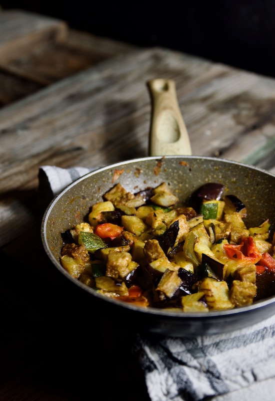 Scaldate un filo d’olio extravergine d’oliva in una padella e fate rosolare l'aglio, poi unite le verdure e saltate a fiamma vivace per qualche minuto quindi condite con un pizzico di sale, pepe nero e una manciata di erbe aromatiche e fate cuocere per 7-8 minuti.