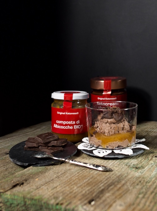 Ora potete assemblare le coppette; versate in ogni coppetta un ‘pò della mousse, coprite con la COMPOSTA DI ALBICOCCHE BIO Ketolight e sopra versate la mousse rimasta.