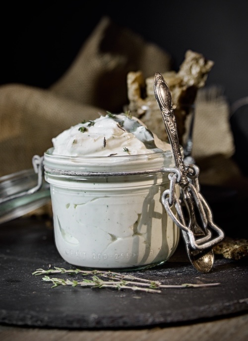 Unite la feta, lo yogurt greco e l'aglio in un robot da cucina e frullate . Mentre il robot è in funzione, versate l'olio d'oliva attraverso l'apertura superiore e continuato finché la feta non è montata e la consistenza è liscia. Unite il timo ed il peperoncino, amalgamate bene e trasferite in una ciotola, a piacere aggiungete ulteriore olio d'oliva e servite.