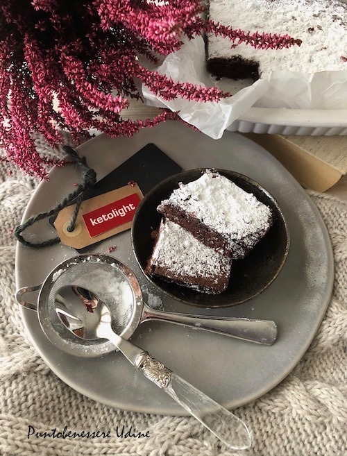 La ricetta di questa seconda domenica di gennaio è un copia e incolla dal blog della nostra amica Maryann Mazzella che ho leggermente modificato omettendo le nocciole perché non ne avevo in casa e spolverizzando il dolce con dell' Eritritolo a Velo semplicemente perché mi piaceva l'dea dell'effetto cromatico del velo bianco su una base scura .