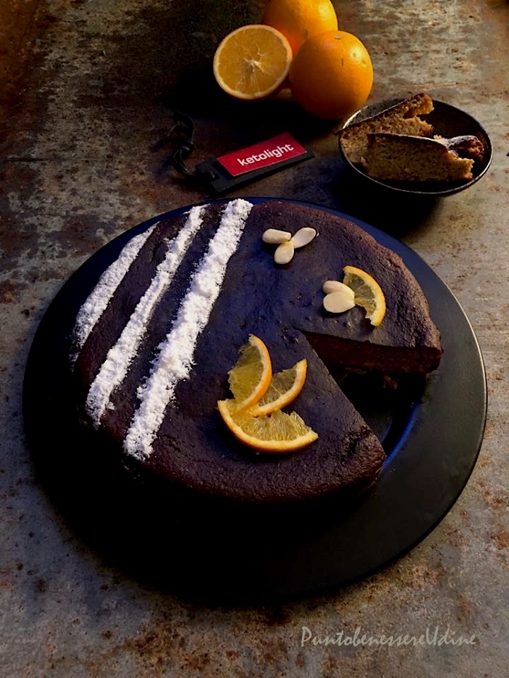 Ho foderate il fondo di uno stampo rotondo (24cm) con della carta da forno bagnata e strizzata e versato dentro il composto che poi ,ho livellato bene con una spatola e infornato a 180° per circa 45 minuti, quindi, dopo la prova stecchino, ho sfornato il dolce , l'ho lasciato intiepidire e decorato con del ERITRITOLO A VELO Xucker, qualche mandorla e fettine sottili d'arancia.