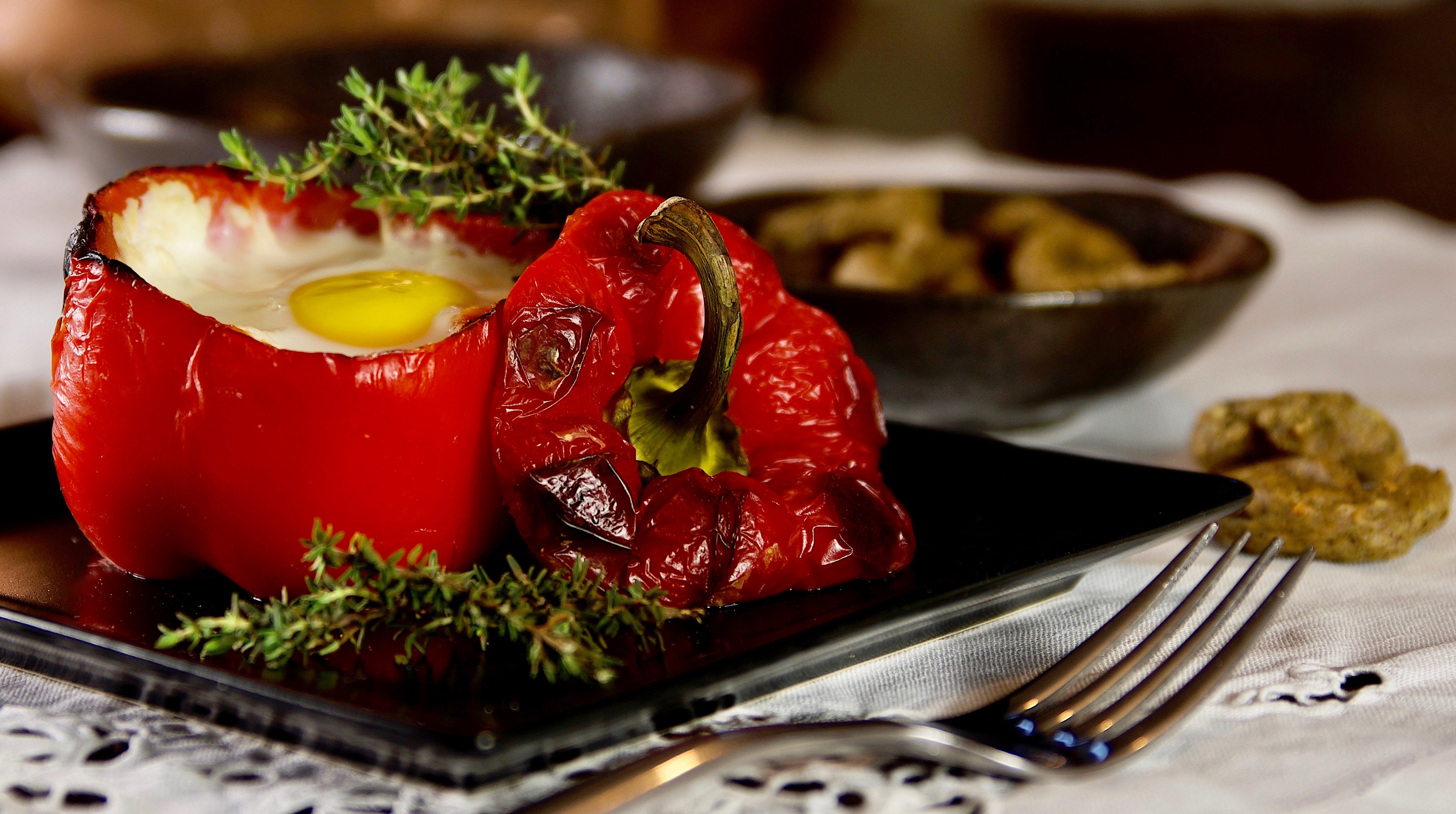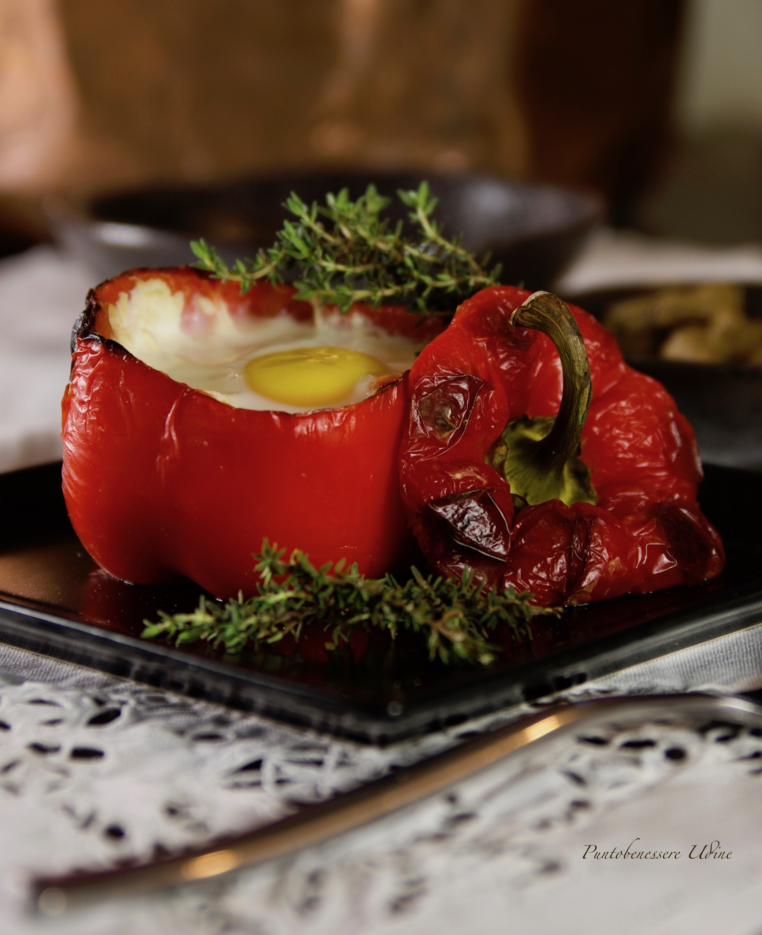 Lavate accuratamente i peperoni, tagliate la calotta superiore facendo attenzione a mantenerla intera e con l’aiuto di un coltellino rimuovere i filamenti interni ed i semi  quindi farcite , senza riempirli del tutto, i peperoni interi con i formaggi precedentemente amalgamati insieme, poi sistemarli in piedi in una teglia , e cuocere in forno preriscaldato a 180° per circa 30 minuti. A circa 5 minuti dal termine della cottura, estrarre dal forno e sgusciate in ciascun peperone un uovo, facendo attenzione a non farlo fuoriuscire. Regolate di sale e pepe e passare sotto il grill per gli ultimi 5 minuti di cottura.