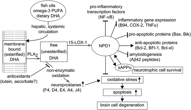 Figura 3 Vie metaboliche del DHA; Tratto da: R. Palacios-Pelaez et al; Omega-3 Essential Fatty Acids Modulate Initiation and Progression of Neurodegenerative Disease, Molecular Neurobiology, Volume 41, Issue 2–3, pp 367–374, 2010.