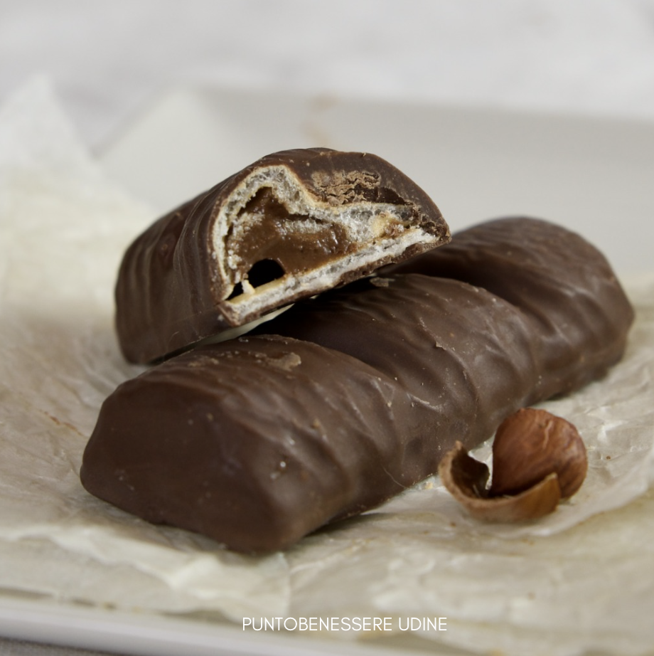 Cialda di wafer ricoperta di cioccolato con ripieno di crema al cacao e nocciola. Ad elevato contenuto di proteine e di fibre. Con edulcoranti.