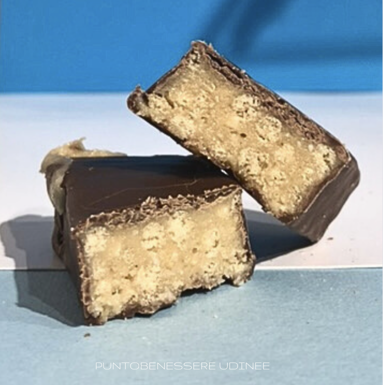 INGREDIENTI: miscela proteica (proteine di soia*struturata, proteine del latte, gelatina idrolizzata), polidestrosio, oligofruttosio 8esratto da cicoria ) oli vegetali (oio di palmisto, olio di palma e di karitè, olio di girasole ) umettante glicerina, fiocchi di noce di cocco 2,3%) burro di cacao, emulsionante:lecitina di soia*, mono e di-gliceridi, polvere di cacao crema di noce di cocco in polvere, aromi, sale, edulcoranti sucralosio acesulfame di potassio