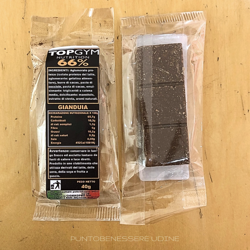 TOPGYM 66% gusto GIANDUIA  confezione singola da 40g Le barrette TOPGYM sono artigianali, prodotte e confezionate in Italia,  snack gustoso e naturale da consumare in ogni momento della  giornata. INGREDIENTI: agglomerato proteico (isolato proteico del latte*, agglomerante:gelatina alimentare), bu ...Altre informazioni
