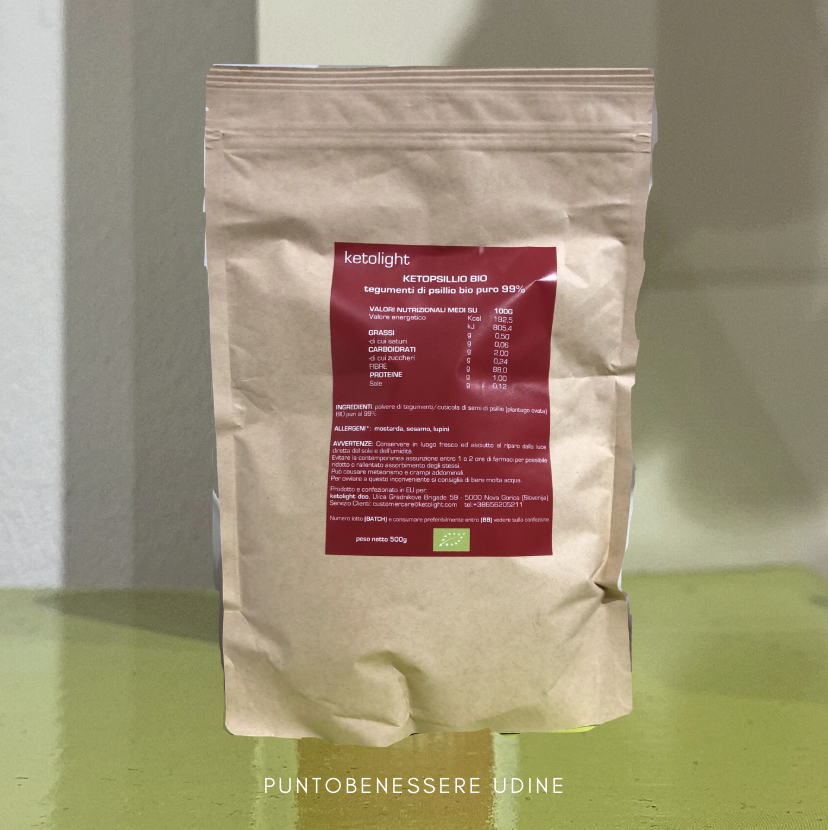 KETOPSILLIO BIO è costituito da tegumenti puri al 99% di psillio biologico (Plantago Ovata). Naturalmente ricco di fibre solubili, contribuisce alla regolarità del transito intestinale e alla sensazione di leggerezza, sostenendo il benessere quotidiano in modo naturale.