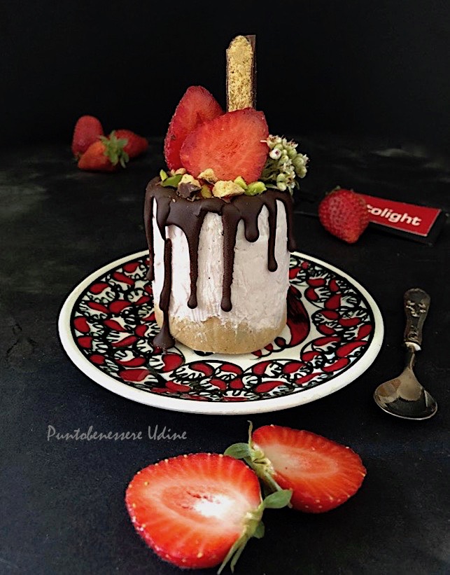 Tolto il dolcetto dalla formina mi sono divertita a decorare con fragole , cioccolato fondente KETODARK 80 sciolto a bagnomaria , KETOSTICK CIOCCOLATO e granella di pistacchi.