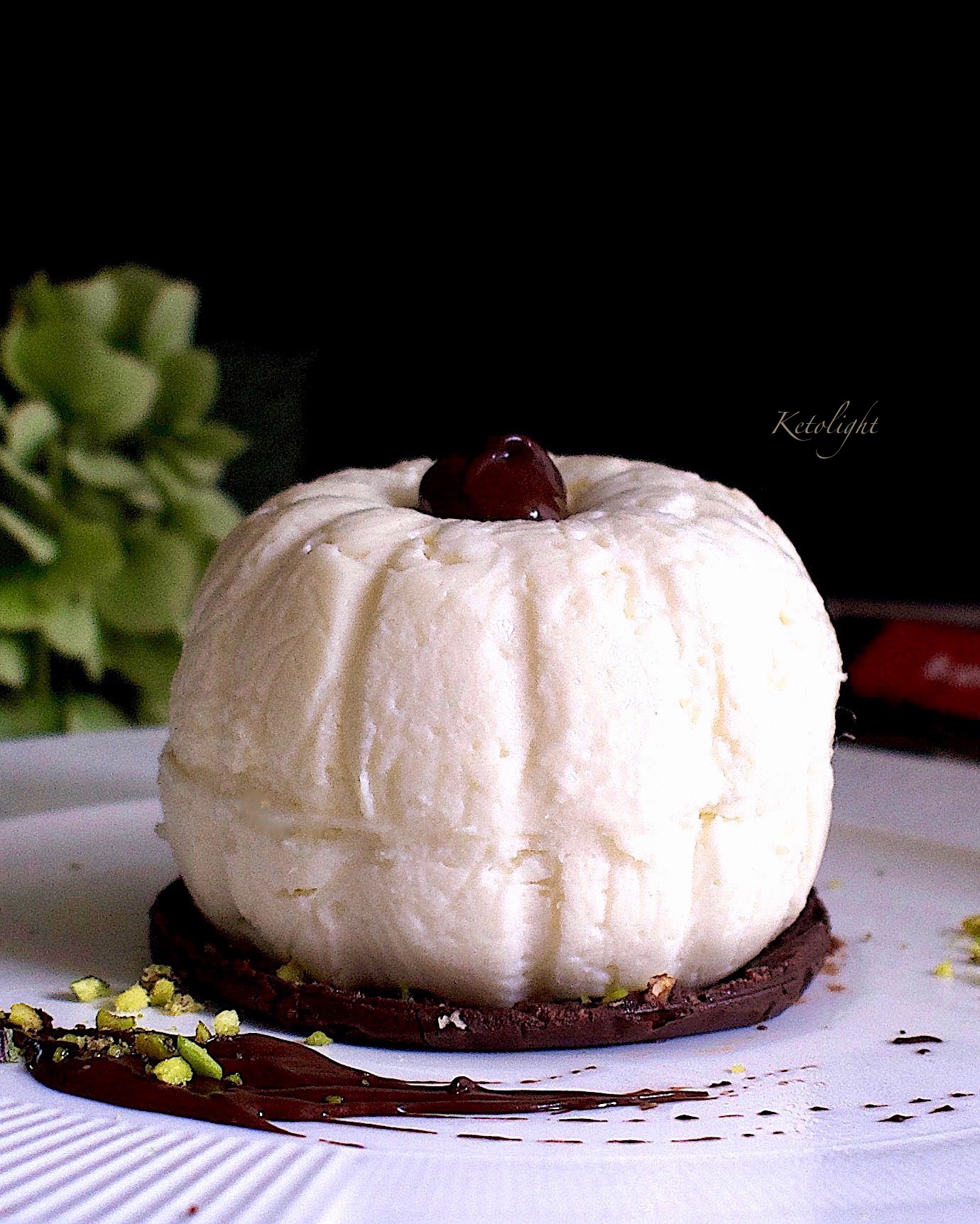 Per prima cosa abbiamo preparato la base sciogliendo a bagnomaria il KETO 80 Ketolight con un cucchiaino di panna a cui abbiamo aggiunto della granella di pistacchio e steso su uno stampino rotondo foderato di carta forno che abbiamo messo a rassodare in frigo (noi, come stampino, abbiamo usato il coperchio di un vaso di vetro).