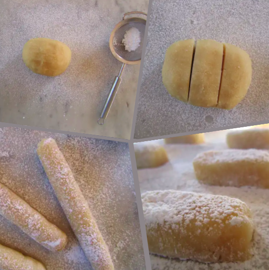 Il giorno dopo abbiamo cosparso di KETOSUGAR VELO KETOLIGHT un piano e sopra abbiamo lavorato l'impasto formando un salsicciotto che abbiamo poi tagliato a dischi e sagomato in ovali spessi circa 1 cm.