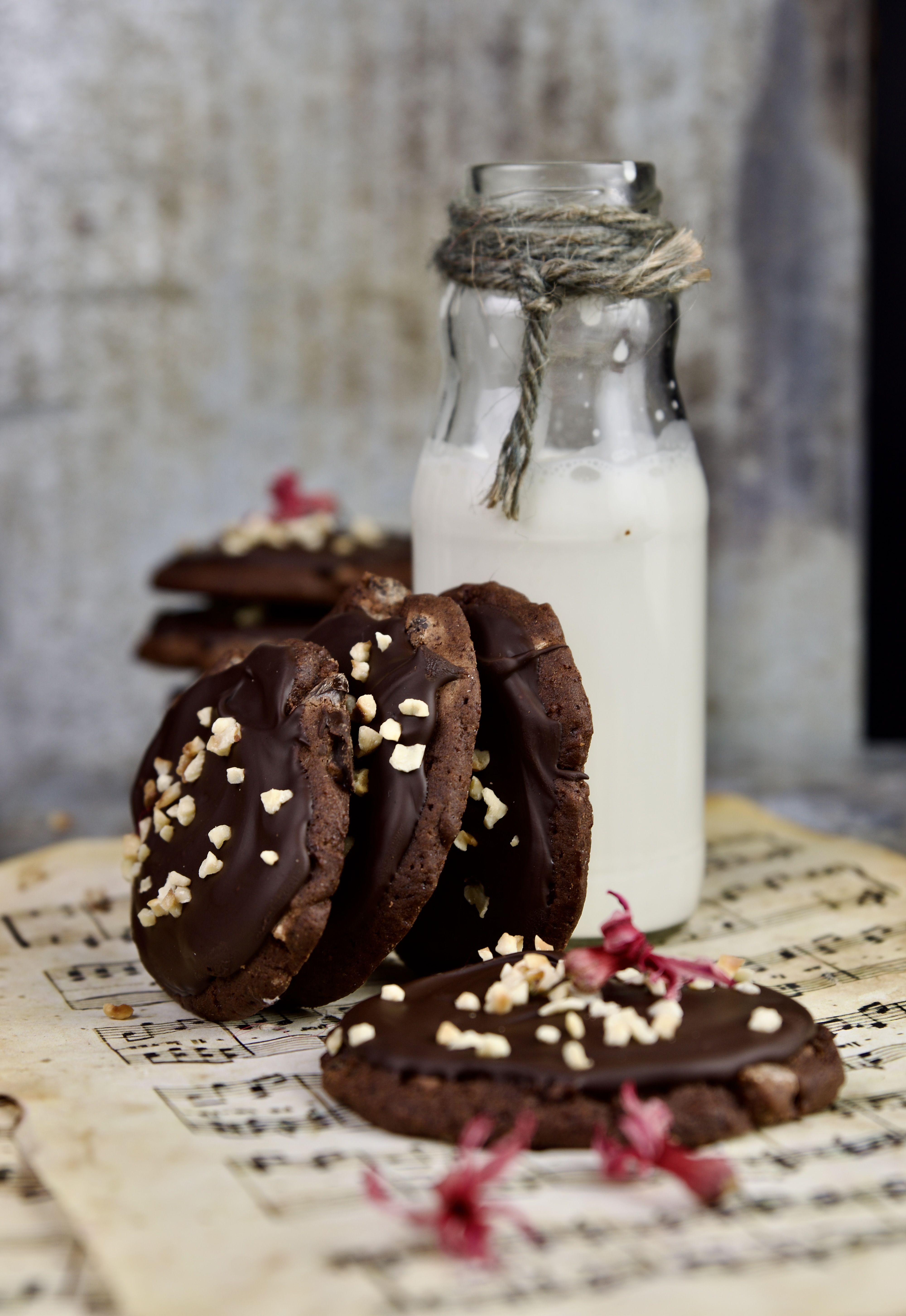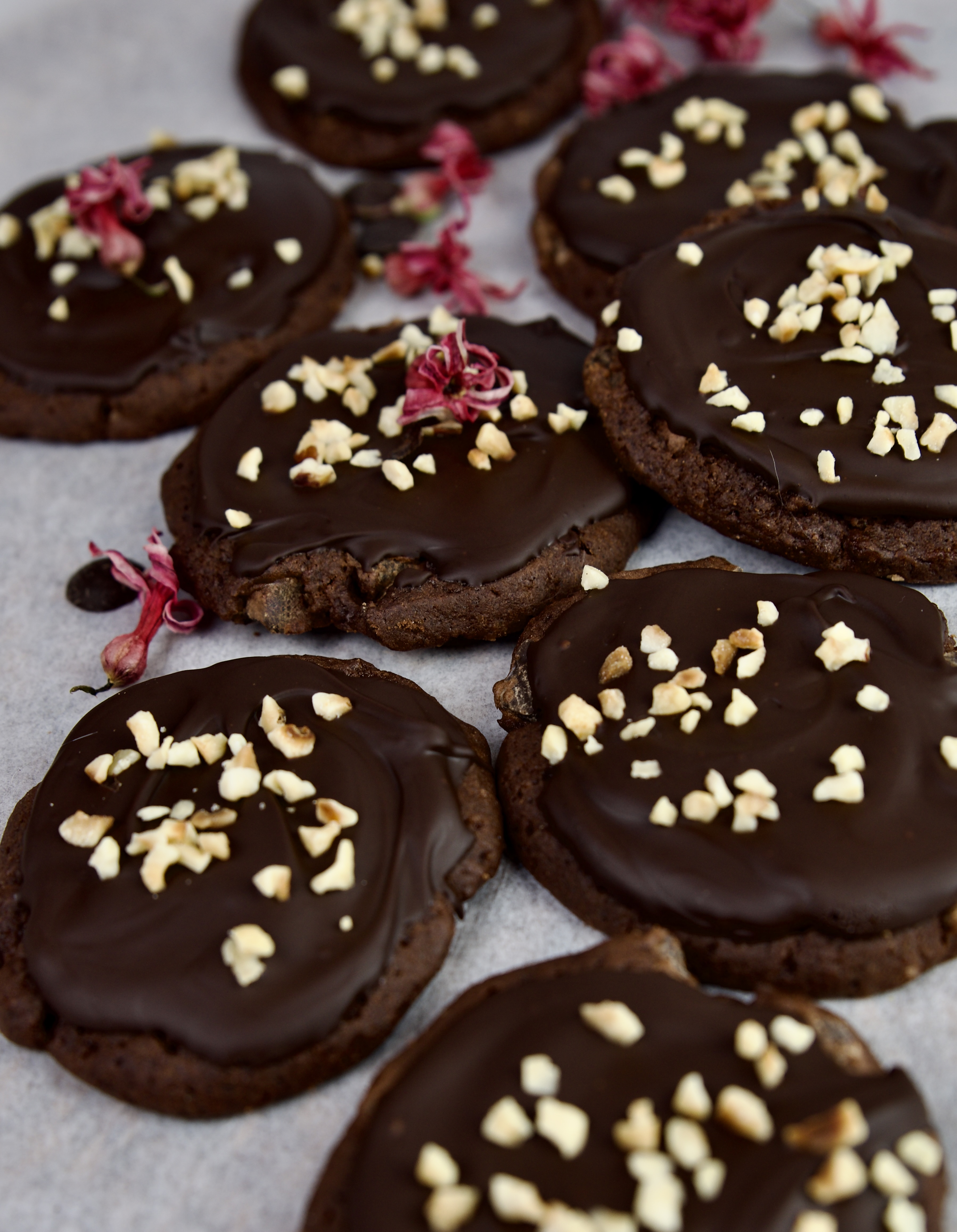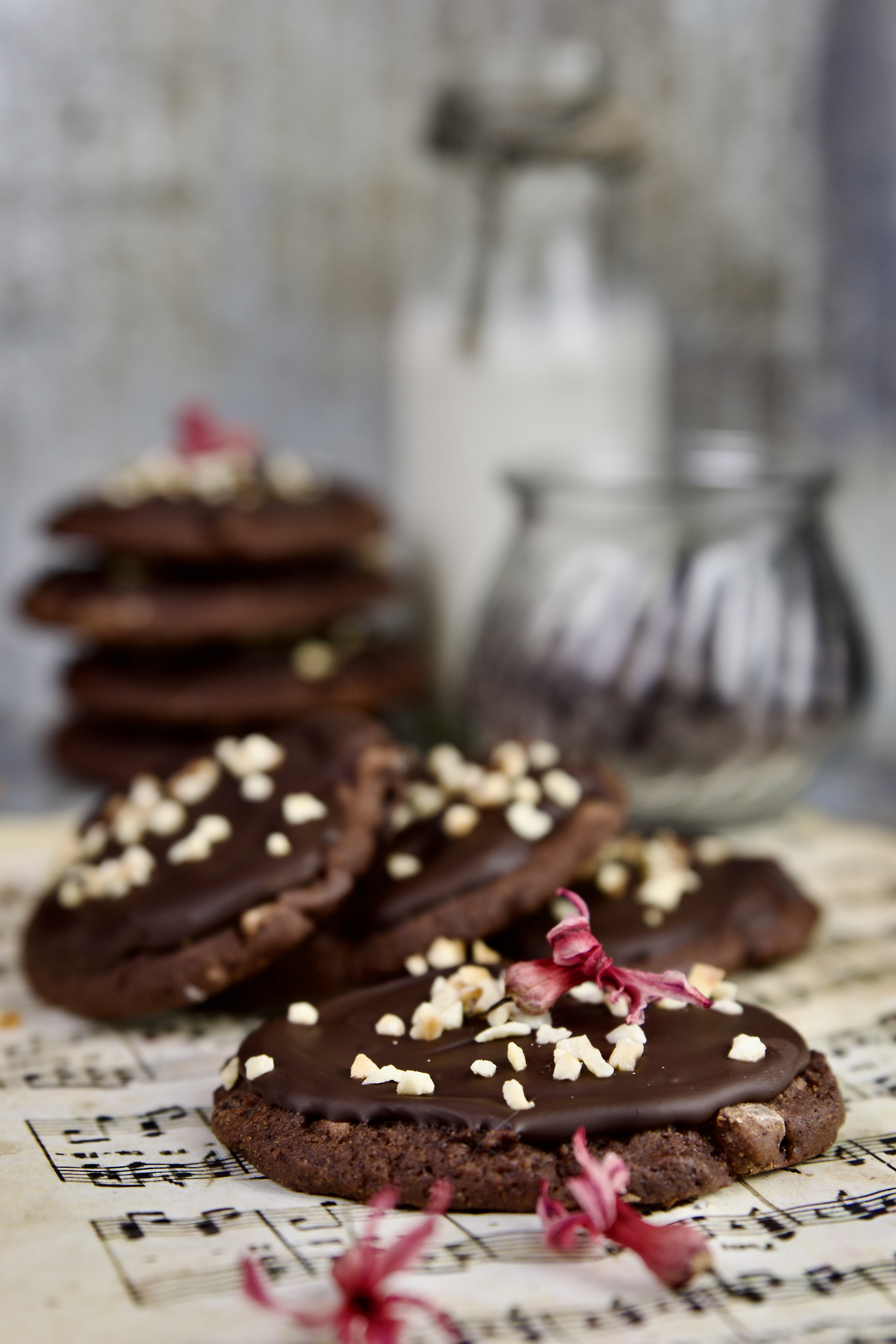 Questi biscotti, appena sfornati, hanno la texture di un brownie, poi seccandosi cambiano consistenza e diventano piuttosto croccanti.