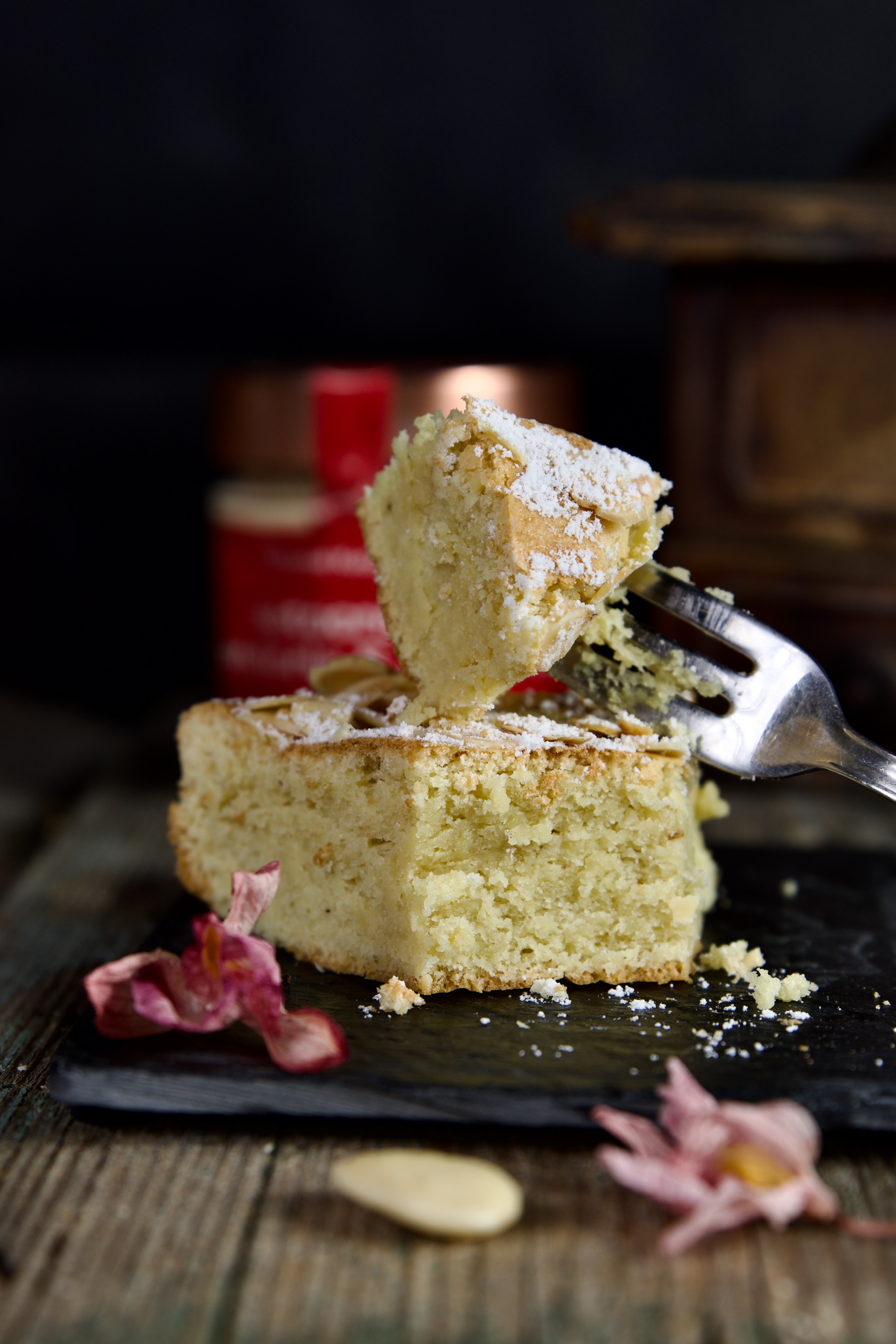 Cuocete la torta nel forno statico preriscaldato a 175° per 30 minuti. A metà cottura, cospargete la superficie con le scagliate di mandorla e continua la cottura nel forno.