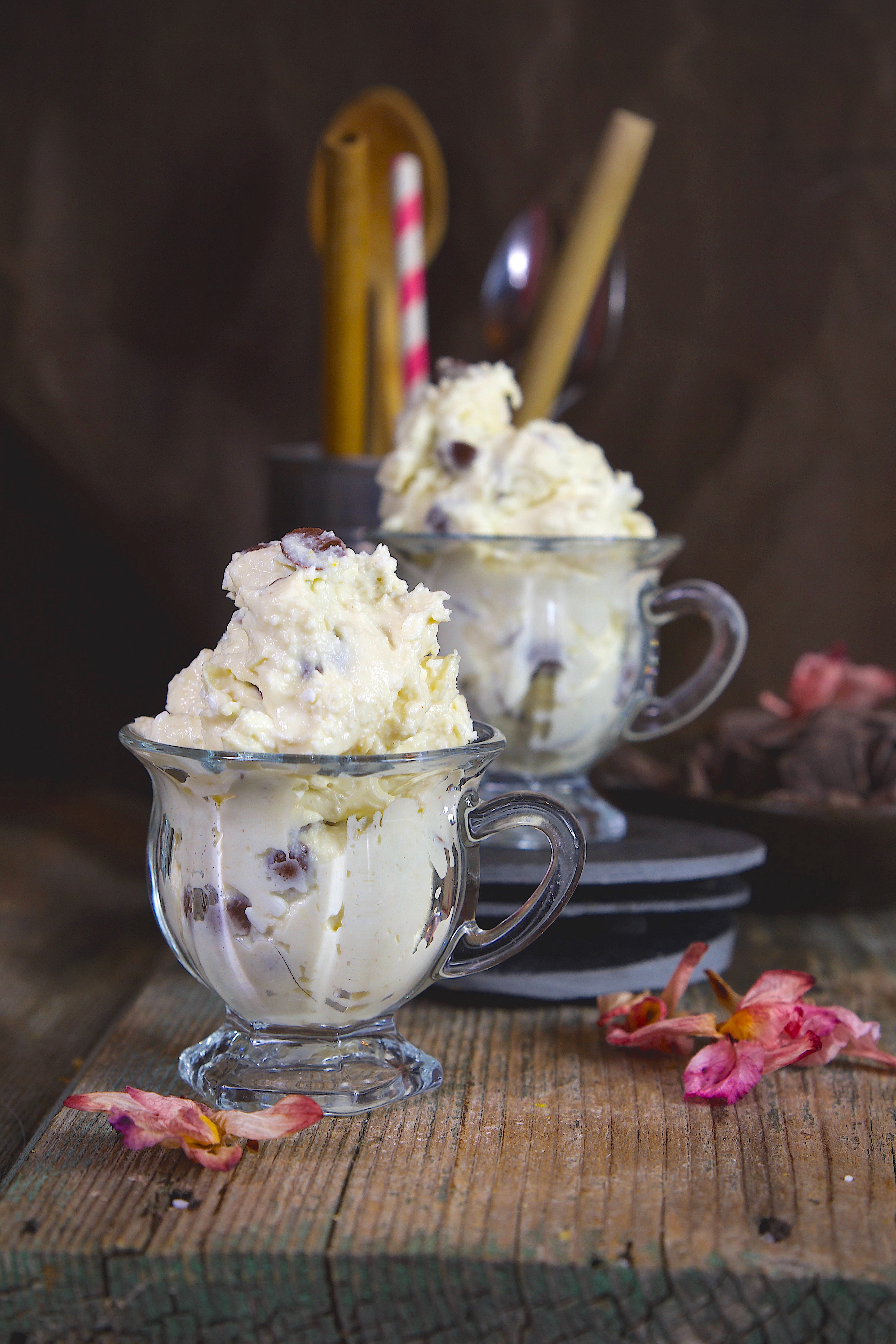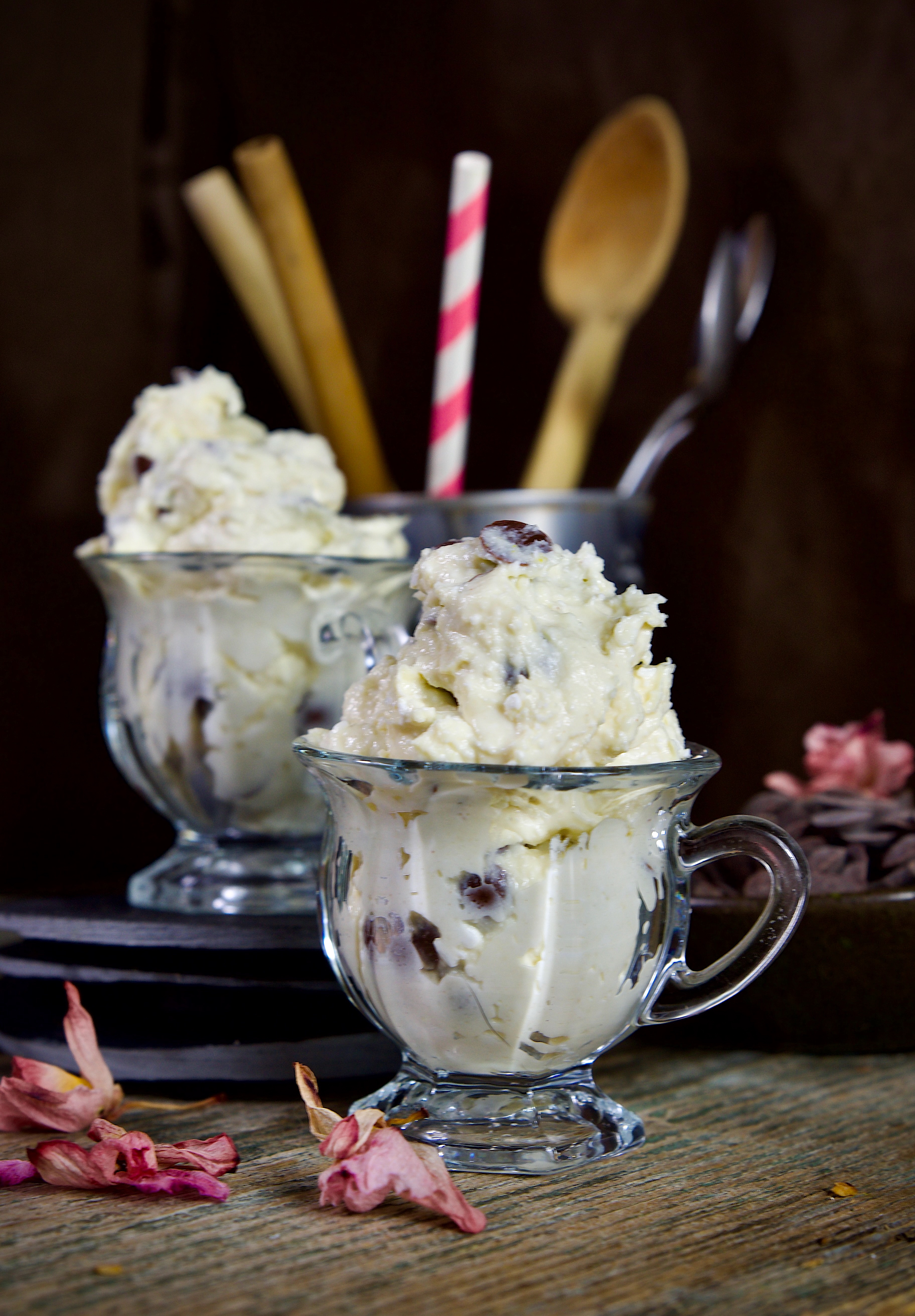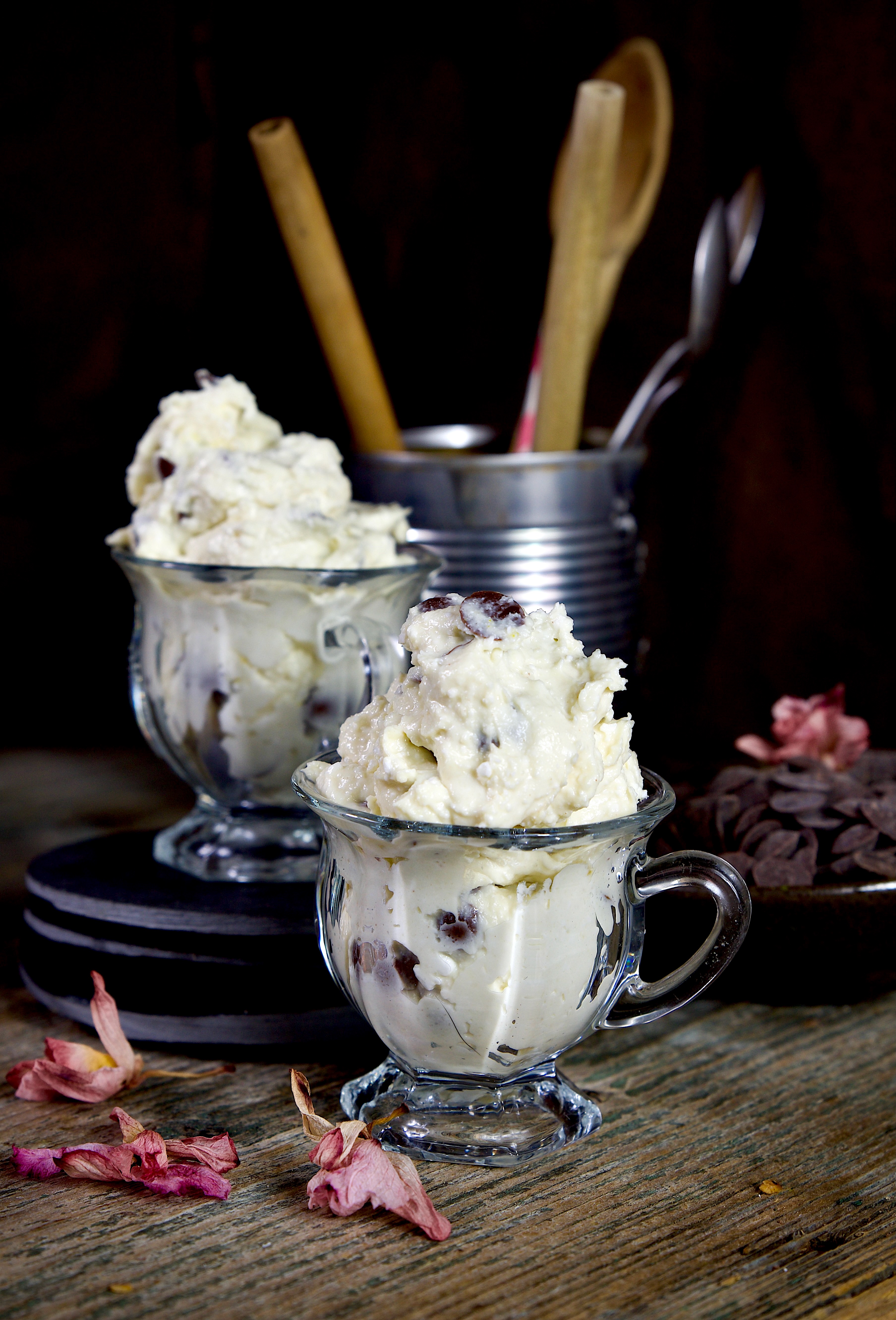 Gli ingredienti previsti nella ricetta originale sono burro, zucchero, farina ed estratto di vaniglia ai quali vengono aggiunte le gocce di cioccolato utili per conferire un effetto croccante all'impasto, c’è poi la versione con crema di formaggio e gocce di cioccolato, servita come un vero e proprio dolce al cucchiaio, fresco e adatto alla stagione calda e noi , di questa versione, senza allontanarci dal risultato finale , abbiamo cercato, tramite la sostituzioni di alcuni ingredienti, di rendere questo impasto meno calorico, proteico e più leggero rispetto all'originale.