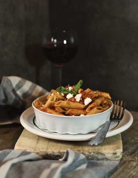 Impiattate, aggiungete la feta sbriciolata, qualche foglia di basilico tritato e servire la pasta ancora fumante.