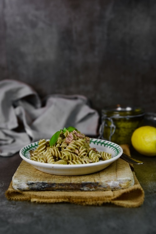 Riunite in un mixer il formaggio grattugiato, la scorza di limone, lo spicchio di aglio sbucciato e privato dell’anima , l’olio, una presa di sale, una macinata di pepe, i pinoli, il basilico e prezzemolo lavati, un cubetto di ghiaccio e circa 80 ml di succo di limone (a piacere potete aumentare o diminuire la dose ) e frullate fino a ottenere una salsa omogenea dal colore verde e dalla consistenza rustica.