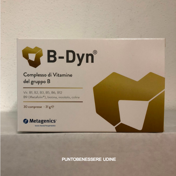 B-dyn è un integratore alimentare contenente 7 vitamine del gruppo B nella forma attiva e ben assorbile dall'organismo, va a supportare il fisiologico funzionamento del sistema nervoso e della funzione psicologica (vit B1, B6, B12, biotina), ostacolando stanchezza ed affaticamento (vit. B2, B3, B5, B12) e a sostenere il normale metabolismo dell'omocisteina (folato, vit B6, B12, colina). La formulazione è arricchita con inositolo, colina e PABA che agiscono in sinergia con il complesso B.