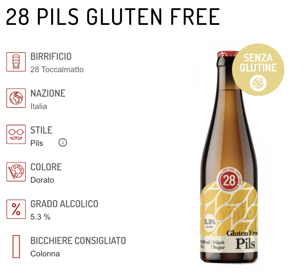 Versione senza glutine della famosa e rinomata 28 Pils. Un omaggio al più classico degli stili tedeschi, i malti Pils le conferiscono note di crosta di pane e miele d'acacia. La luppolatura nobile europea le dona note erbacee, speziate e floreali. Birra secca e di facile beva.